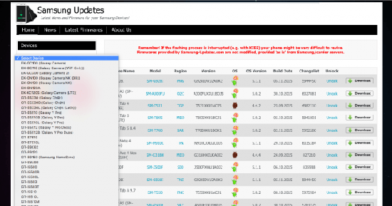 - Загрузите официальную прошивку для вашего гаджета. Для этого лучше всего подходит сайт Samsung-Updates.com: в разделе “Devices” бокового меню кликаем по “select Device” и выбираем в списке модель вашего устройства.