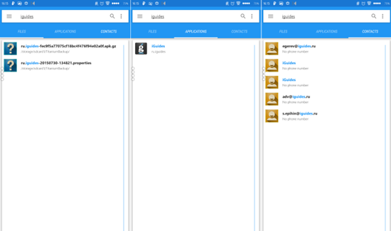 Индексация файлов осуществляется очень быстро даже на устройствах с большим накопителем и картой памяти большого объема. Буквально пара секунд — и десятки гигабайт данных просканированы и занесены в базу. Поиск еще более шустрый, фактически моментальный. Найденное рассортировано по трем разделам: файлы, приложения и контакты из телефона или электронной почты. Прямо в приложении можно удалить или переименовать любой найденный файл. Когда необходимо выполнить какое-то другое действие, например, позвонить найденному контакту или отправить файл по электронной почте, нажмите на результат поиска — откроется меню со всеми возможными вариантами.