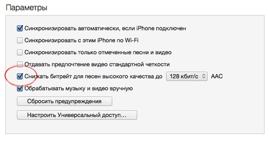 Чтобы воспользоваться опцией понижения битрейта, необходимо выбрать устройство в боковой панели iTunes и поставить галочку «Снижать битрейт для песен высокого качества до 128 Кбит/с AAC”» в разделе параметры. При этом диаграмма статуса в нижней части iTunes, демонстрирующая заполнение памяти, отобразит изменение свободного пространства. В некоторых случаях экономия может достигать 5 гигабайт и больше.