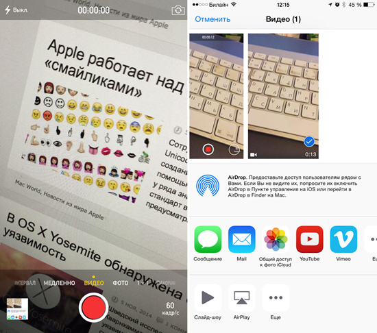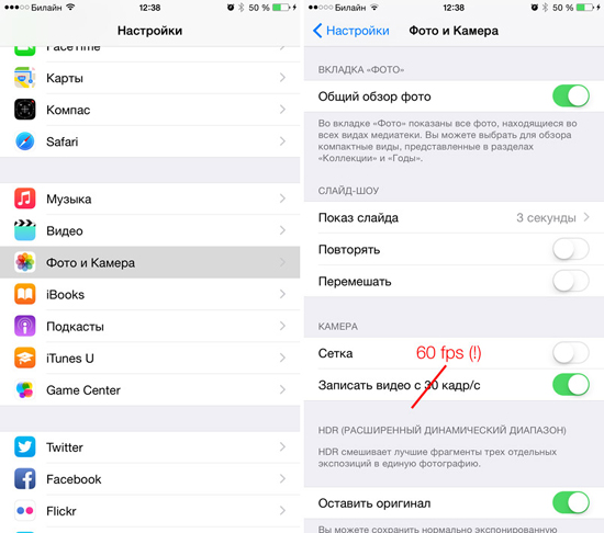Возможность снимать видео с частотой 60 fps доступна для iPhone 6 и iPhone 6 Plus. По умолчанию функция выключена. Чтобы активировать этот режим, нужно зайти в меню Настройки –> Фото и Камера и включить тумблер «Запись видео с 30 кадр/с». Почему 30 кадр/с? Дело в том, что при локализации интерфейса на русский язык Apple допустила ошибку и вместо «60 кадр/с» мы имеем «30». Убедиться в этом просто – после активации режима, в приложении Камере появляется индикатор «60 кадр/с».
