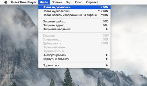 Откройте вкладку «Файл» и выберите «Новая видеозапись» или запустите эту функцию сочетанием клавиш «Shift+Command+N».