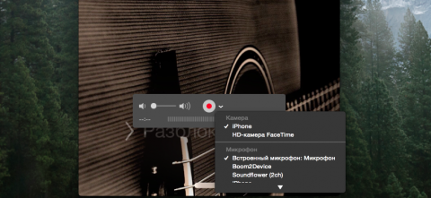 Включится камера FaceTime на Mac, после чего нужно указать в качестве устройства захвата подключённый гаджет. Для этого нажмите на стрелочку возле иконки записи и выберите своё iOS устройство. Вы также можете выбрать качество записи и микрофон, который будет писать звук. Вам будет предложено два варианта: использовать встроенный в Mac или в iOS устройство.