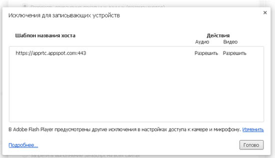 2. Появится окошко со списком исключений для записывающих устройств, где указаны все хосты, которым разрешено активировать камеру и микрофон.