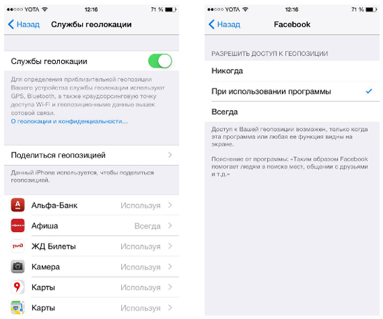 Открываем «Настройки», далее «Конфиденциальность» — «Службы геолокации». В появившемся разделе находим приложение «Facebook» и выбираем «Никогда». Несмотря на то, что у меня выбран параметр определять геопозицию при использовании программы, она занимается этим даже тогда, когда не запущена.