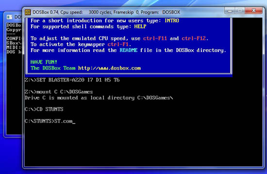 7. Вспомните или узнайте, какой файл запускает игру, и впишите его имя в командную строку. В случае со Stunts команда будет «C:\STUNTS\ST.com».