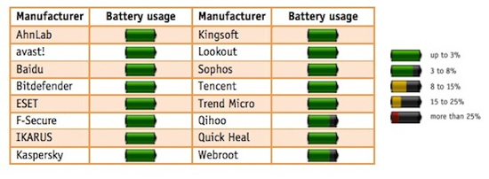 Они протестировали 16 различных продуктов, среди которых – Lookout, ESET, Sophos, Kaspersky, Trend Micro, F-Secure и Avast. Учитывалась не только энергоэффективность, но и работоспособность как антивируса. Для этого приложениям «скормили» более 3 тыс. зловредных приложений. Таблица победителей распределилась следующим образом: