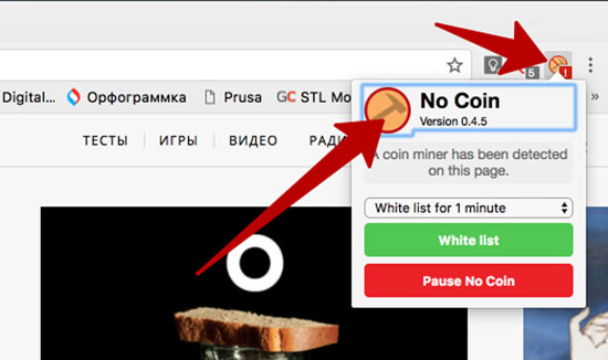 Для браузера Google Chrome предусмотрено специальное расширение No Coin (Скачать). При переходе на сайт, на котором размещен скрипт скрытого майнера, в No Coin загорится восклицательный знак, а процесс майнинг будет приостановлен.