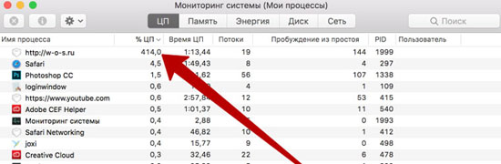 На Mac открываем Программы —> Утилиты —> Мониторинг системы, переходим на вкладку ЦП и сортируем все активные задачи по загрузке процессора. Для Windows откройте Диспетчер задач, нажав комбинацию клавиш CTRL + ALT + DEL.