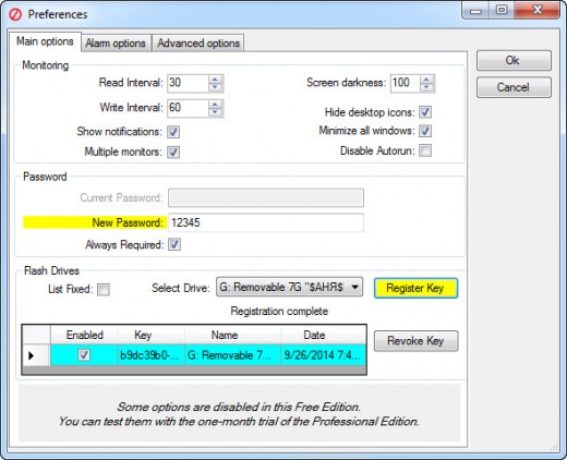 Обратите внимание на следующие опции. Параметр Read Interval отвечает за периодичность проверки подключения флешки к компьютеру. По умолчанию значение выставлено на 30 секунд. По истечении забитого времени программа проверит наличие ключа и, в случае его отсутствия, затемнит экран монитора.