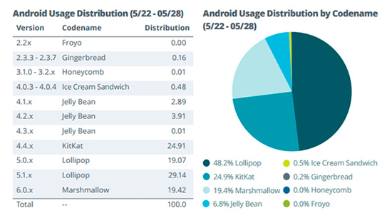 Последний отчет Google показал, что около 23% используемых сейчас мобильных устройств с Android работают под управлением старых систем (Android 4.3 и старше). Практически вся активность (93%) приходится именно на устройства с Android 4.4, Android 5.0/5.1 и Android 6.0.