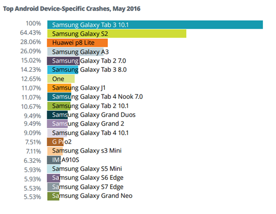 При этом аналитики Apteligent после анализа 400 млн сбоев увидели, что наиболее проблемными устройствами являются смартфоны и планшеты компании Samsung. Причем это в основном старые модели, хотя и актуальные флагманы тоже попали в список. Правда, устройства Samsung являются самыми распространенными.