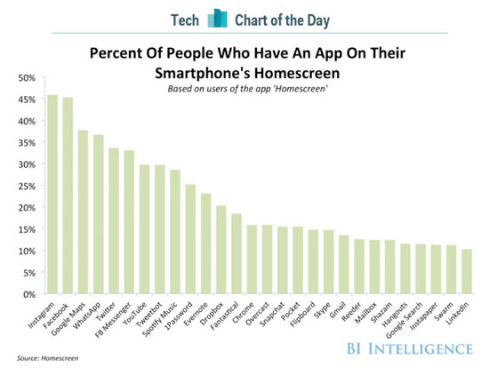 Сотрудники Betaworks проанализировали 13 000 скриншотов домашних экранов с 500 000 приложений, пишет Lookatme. Пять самых популярных приложений — Instagram (установлено на 45,82% экранов), Facebook (45,26%), Google Maps (37,71%), Twitter (33,63%) и Facebook Messenger (33,09%). Таким образом, из 28 самых популярных приложений шесть принадлежат Google, четыре — Facebook и два — Dropxbox. При этом пять приложений можно классифицировать как мессенджеры, четыре — как приложения для чтения новостей, три — как социальные сети и два — как приложения для работы с почтой.