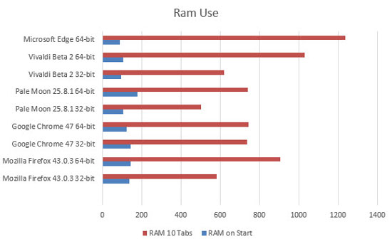 Для проверки разницы между браузерами исследователь замерял использования оперативной памяти сразу после запуска. Далее он открывал 10 сайтов (ghacks.net, startpage.com, youtube.com, betanews.com, reddit.com, slashdot.org, producthunt.com, twitch.com, amazon.com, google.com) и смотрел, сколько веб-навигаторы потребляют ОЗУ. После этого он запускал специализированные тесты работы браузера (Mozilla Kraken benchmark, JetStream benchmark, Google Octane benchmark, RoboHornet benchmark, Dromaeo benchmark), но они интересны только разработчикам.