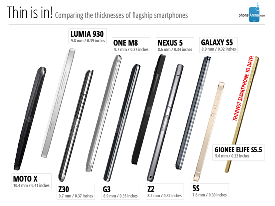 Но рекорд есть рекорд. Его, в любом случае, нужно побить. По версии сайта Phonearena, самым тонким смартфоном станет ещё не анонсированный Gionee GN9005, в сертификационных документах которого указана толщина всего в 5 мм (!).