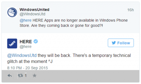В официальном Twitter-аккаунте HERE уже появилось сообщение, что приложения вскоре снова будут доступны в магазине, а их исчезновении связано с техническими проблемами.