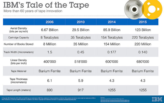 Все перечисленные выше аспекты чётко отслеживает компания IBM и год за годом повышает плотность записи на ленте. На днях вместе с японской компанией Fujifilm она сумела поставить новый рекорд в увеличении плотности записи. На каждом квадратном дюйме магнитного слоя теперь можно записать 123 Гбит информации. Это в 88 раз больше, чем может обеспечить современный картридж поколения LTO6. Новая лента позволит довести ёмкость одного картриджа до 220 Тбайт. Представьте себе книжную полку с фолиантами длиной 2200 километров — это примерно 220 млн книг. Примерно столько информации сможет поместиться на новом картридже.
