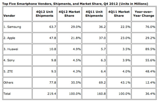 Специалисты IDC подсчитали, что за прошлый 2012 год Huawei удалось увеличить свою долю рынка смартфонов на невероятые 89,5 %. Такими цифрами не может похвастать ни один производитель "умных" телефонов! ZTE также держится на уровне: доля компании увеличилась на приличные 48,4 %. Таким образом Huawei впервые попал в тройку лидеров, поставив 10,8 млн. девайсов в последнем квартале прошлого года. Компания ZTE прорвалась в первую пятерку с 9,5 млн. отгруженных устройств. В результате за бортом оказались менее удачливые LG и HTC, что еще год назад было сложно себе представить.