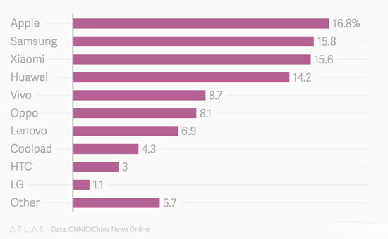 В докладе говорится, что 780 млн китайцев являются владельцами смартфонов — 59% населения страны. Из них 16,8%, или 131 млн человек, владеют iPhone. В США, по данным Apple, число владельцев iPhone составляет около 100 млн. человек. Второе место на китайском рынке занимают смартфоны Samsung, третье — Xiaomi. Ими пользуется 15,8% и 15,6% населения страны соответственно.