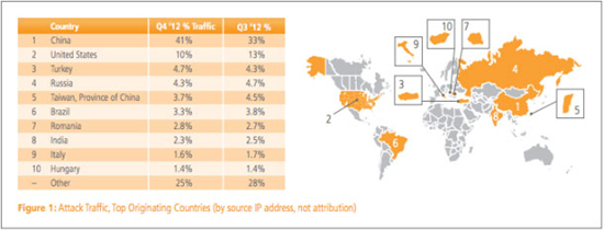 Крупнейший мировой оператор сетей по доставке контента Akamai Technologies сегодня опубликовал отчет The State of Internet за последний квартал 2012 года. Согласно отчету, Китай остается крупнейшим генератором вредоносного трафика. Из этой страны проводились 41% атак на клиентов, обслуживаемых Akamai. В третьем квартале 2012 года этот показатель составлял 33%.