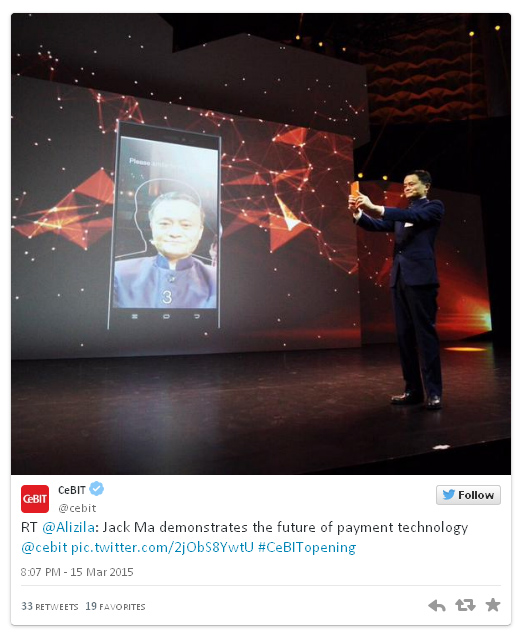 «Я хочу воспользоваться этой возможностью и продемонстрировать небольшой инновационный продукт, который мы разработали…Онлайн-платежи для покупок это всегда головная боль. Вы забываете пароль, беспокоитесь о безопасности. Сегодня мы вам покажем новую технологию, как люди в будущем будут покупать вещи в интернете», — сказал в ходе выступления на CeBIT глава Alibaba Group и совершил покупку в своем интернет-магазине, оплатив ее при помощи фронтальной камеры смартфона и появления себя в кадре.