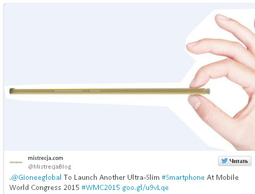 Китайская компания Gionee может представить самый тонкий смартфон в мире. Производитель собирается презентовать новый гаджет во время выставки Mobile World Congress 2015 в Барселоне. Некоторые характеристики и фотографии девайса "утекли" в Сеть. Это дало повод предположить, что среди тонких смартфонов опять сменится лидер. Об этом сообщает Phonearena.
