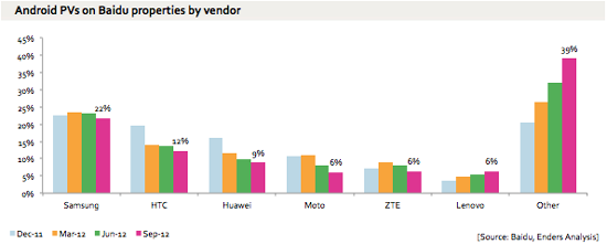 Такой вывод основан на данных о мобильном трафике Baidu за первые 9 месяцев 2012 года. Как видно, данные, потребляемые аппаратами ведущих брендов, сократились, в то время как «Прочие» аппараты удвоились с 20 до 39%.