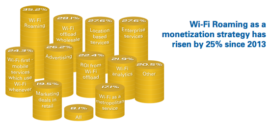 В докладе также утверждается, что Wi-Fi роуминг по-прежнему является важным способом расширить охват оператора, особенно на международном уровне. Доля операторов хотспотов, заключивших роуминговые договоры, увеличилась с 30% в 2013 году до чуть более 50% в этом году.
