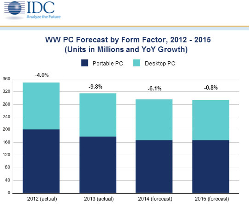 IDC предполагает, что в 2014 г. динамика рынка будет отрицательной, а год завершится со снижением продаж на 6,1% и с объемом около 295,6 млн ПК.