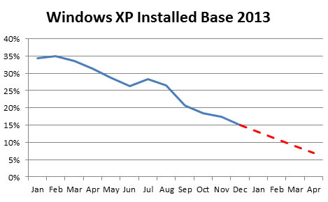 Стоит отметить, что Кандек не верит в то, что все пользователи откажутся от ОС до 8 апреля следующего года. Свидетельством тому является составленный им график, согласно которому на момент прекращения поддержки Windows XP с ней будет работать порядка 13% пользователей по всему миру.
