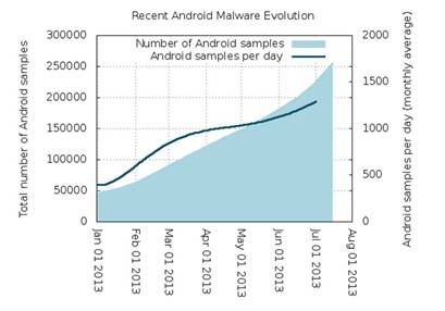 Исследование показало, что количество угроз для мобильных устройств выросло за последние шесть месяцев на 30%.Ежедневно появляется более 1300 новых угроз. Было также зафиксировано более 300 уникальных типов угроз семейства Android и более 250 000 уникальных экземпляров вредоносных программ.