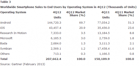На рынке мобильных смартфонных ОС самый яркий рост переживает платформа Microsoft. Windows Phone за год продемонстрировала взрывной рост на 124.2%, заняв долю в 3% продаж за квартал. В абсолютных цифрах за 4Q2012 было продано чуть более 6 млн смартфонов на системе Microsoft. Все остальные игроки, кроме Android, показали падение своей доли. Самым значительным стало уменьшение продаж устройств на Symbian с 17.5 млн до 2.5 млн за год. Платформа от Google также значительно укрепила своё положение: с 51% рыночных продаж в 4Q2011 до 69.7% в этом году. Общий рост составил 88%. Количество проданных смартфонов с Apple iOS тоже увеличилось, но рынок рос быстрее продаж iPhone, поэтому увеличение количества iГаджетов на 8 млн. не уберегло от падения доли до 20.9% с 23.6% в 4Q2011.