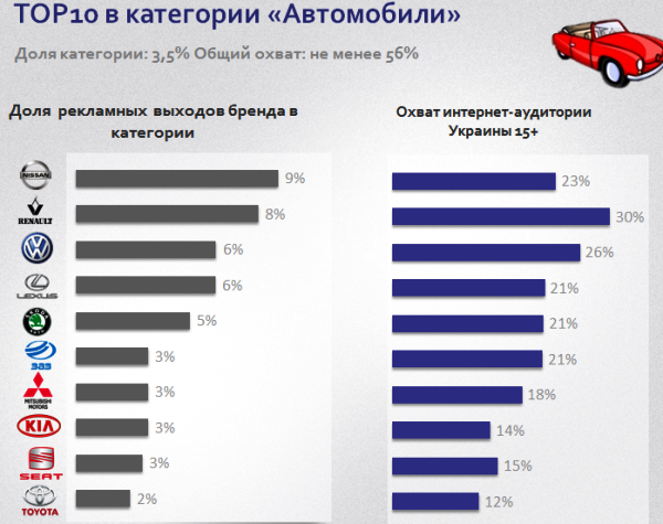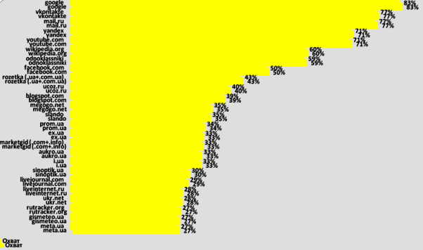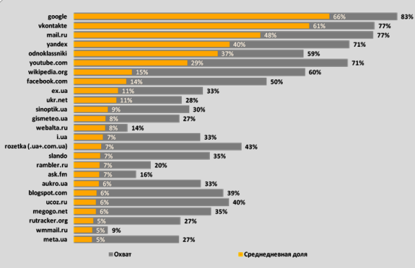На заседании Комитета ИнАУ по вопросам интернет-рекламы оглашены данные мартовских исследований интернет-аудитории Украины. Исследование выполняется по заказу ИнАУ компанией InMind. По итогам марта 2013 г., на базе медиапанели численностью 5 тыс. человек, определен список популярных доменов, посещаемых украинскими пользователями: