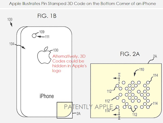 На рисунке, сопровождающем заявку на патент Apple, в качестве примера изображен iPhone, в котором 3D кодирование использовано для маркировки защитного стекла экрана (102) или под защитным стеклом. При этом, для маскировки кода используется затемнение в нижней части защитного стекла (103), скрывающее код.