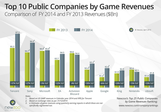 Восьмое место досталось разработчикам Candy Crash Saga из King.com. Им удалось заработать за 2014 год чуть больше 2,2 миллиарда долларов. Замыкают десятку лидеров компании Nintendo и Ubisoft с выручкой в 2 и 1,8 миллиарда соответственно.