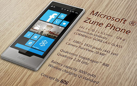 Смартфон Microsoft Zune выполнен в литом алюминиевом корпусе, толщина которого составляет всего 5,5 мм, что дает нам самый тонкий в мире мобильник под Windows Phone, да и весит он всего 126 граммов. В качестве аппаратной платформы выступает Qualcomm Snapdragon 800 с четырехъядерным процессором, а интерфейс системы от Microsoft выводится на 5-дюймовый дисплей Full HD. Съемка фото и видео ведется на мощную 20-мегапиксельную камеру PureView, и, наконец, источником питания является аккумулятор на 3000 мАч, поддерживается беспроводная зарядка стандарта Qi.