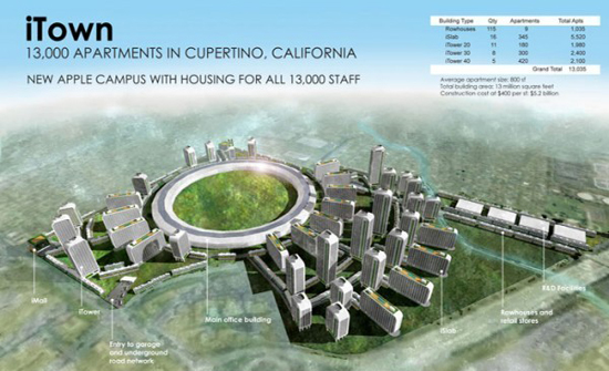 Именно поэтому Альфред Ту предложил концепт iTown — городка, в котором будут проживать сотрудники Apple. Поселение являет собой несколько соединенных между собой микрорайонов с развитой инфраструктурой и многоэтажными домами, способными вместить все 13 тысяч сотрудников Apple.