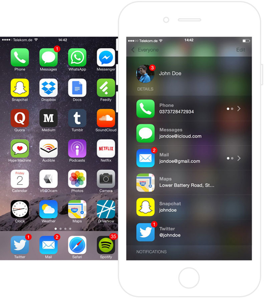 Немец предложил объединить в Адресной книге все возможные способы связи с близкими людьми. Помимо номера телефона, приложение в удобном виде отображает для каждого абонента его аккаунт в iMessage, адреса почтовых ящиков, местоположение на карте, учетные записи в Snapchat, Facebook, WhatsApp, Twitter и т.д.