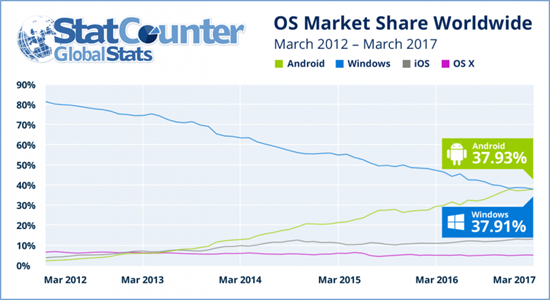 По данным StatCounter, Android заняла первое место не только по мобильным устройствам, но и с учетом настольных ПК, ноутбуков, планшетов и различных комбинированных устройств. Так, в марте 2017 года устройства с Android заняли 37,93%, впервые обогнав Windows, занявшей 37,91%.