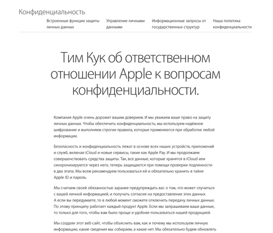 Наша бизнес-модель проста: мы продаём отличные продукты, — пишет Кук в том самом обращении. — Apple не создаёт профилей, основанных на содержании электронных писем или веб-активности пользователя. Информация, которую вы храните на iPhone или в iCloud, не монетизируется компанией, и мы не читаем ваших сообщений, чтобы впоследствии показывать даже интересную вам рекламу. Всё просто и понятно — наше ПО и сервисы призваны сделать устройства лучше.