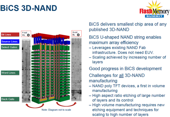 Чипы Toshiba BiCS3 выпускаются с применением 15-нм техпроцесса и могут хранить три бита в ячейке, то есть, являются вариацией на тему 3D TLC. Пионером в применении данного типа памяти является Samsung, разработавшая свою версию под названием TLC 3D V-NAND и использовавшая её в популярной серии накопителей 850 EVO.