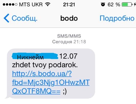 В редакцию InternetUA прислали скриншот рекламного SMS-сообщения. В послании абонента «ненавязчиво» информировали о том, что его друг ждет от него подарок на день рождения. А также присутствовала ссылка, перейдя по которой абонент попадал на сайт интернет-магазина подарков Bodo.