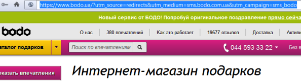 Причины усомниться в непричастности онлайн-магазина к данной рассылке возникли и у экспертов по интернет-маркетингу. «Обратите внимание на важный нюанс: при переходе по указанной в сообщении ссылке пользователь попадает на страницу интернет-магазина Bodo, в адресной строке браузера которой прописано www.bodo.ua/?utm_source=redirects&utm_medium=sms.bodo.com.ua&utm_campaign=sms_bodo. Выделенное – это UTM-метки.