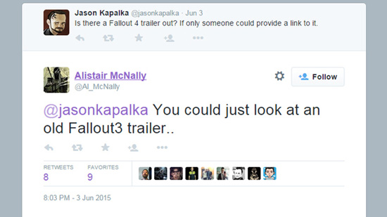 «Можно просто посмотреть старый трейлер Fallout 3…» — предложил геймеру Алистер МакНелли (Alistair McNally) своего канала в твиттере, намекая, что с момента появления третьей части серии в 2008 году ничего не изменилось.
