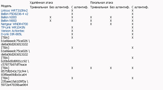 В таблице по «тривиальными» атаками подразумеваются такие, которые могут быть автоматически запущены против маршрутизатора, без человеческого участия. Атаки «без аутентификации» требуют минимального человеческого участия, например, пользователь должен перейти по ссылке на вредоносный сайт. Атаки «с аутентификацией» предполагают, что пользователь должен поддерживать активную сессию во время атаки или злоумышленник получил доступ к аутентификационным данным, таким как имя доступа и пароль по умолчанию.