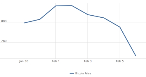 В последние несколько дней курс биткойна по отношению к доллару неуклонно падает. 1-2 февраля он достиг $817, а к 6 февраля снизился до $766 за один биткойн.