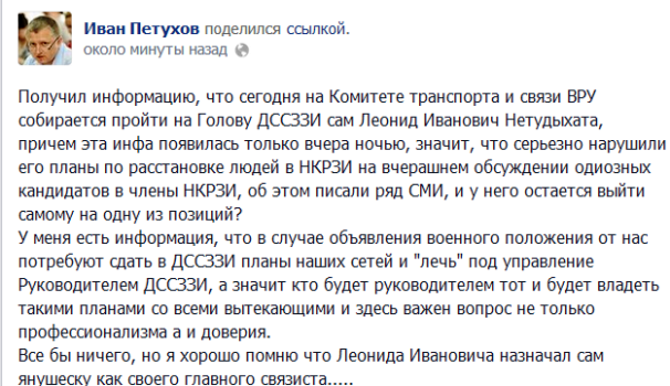 Таким чином, аналіз роботи Держспецзв’язку та її керівництва прямо засвідчили, що діяльність центрального органу влади була спрямована не на виконання встановлених законодавством повноважень, а на лобіювання власних інтересів та інтересів злочинної влади, що на цей час може завдати суттєвих збитків державі та можливості втрати управління телекомунікаційними мережами в умовах надзвичайних ситуацій, надзвичайного та воєнного стану." Конец цитаты.