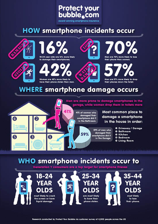 Страховая компания Protect Your Bubble собрала крайне интересную статистику относительно того, кто и как часто ломает свой смартфон, и при каких обстоятельствах это происходит.
