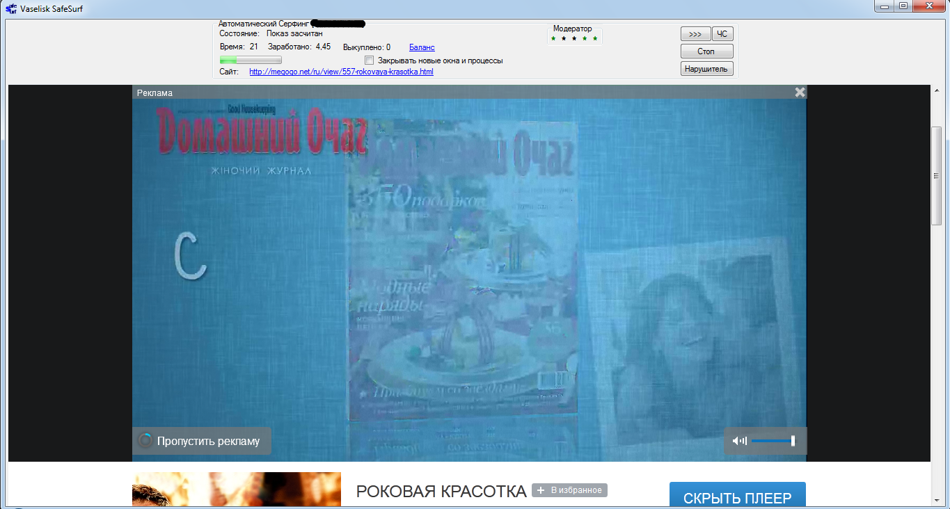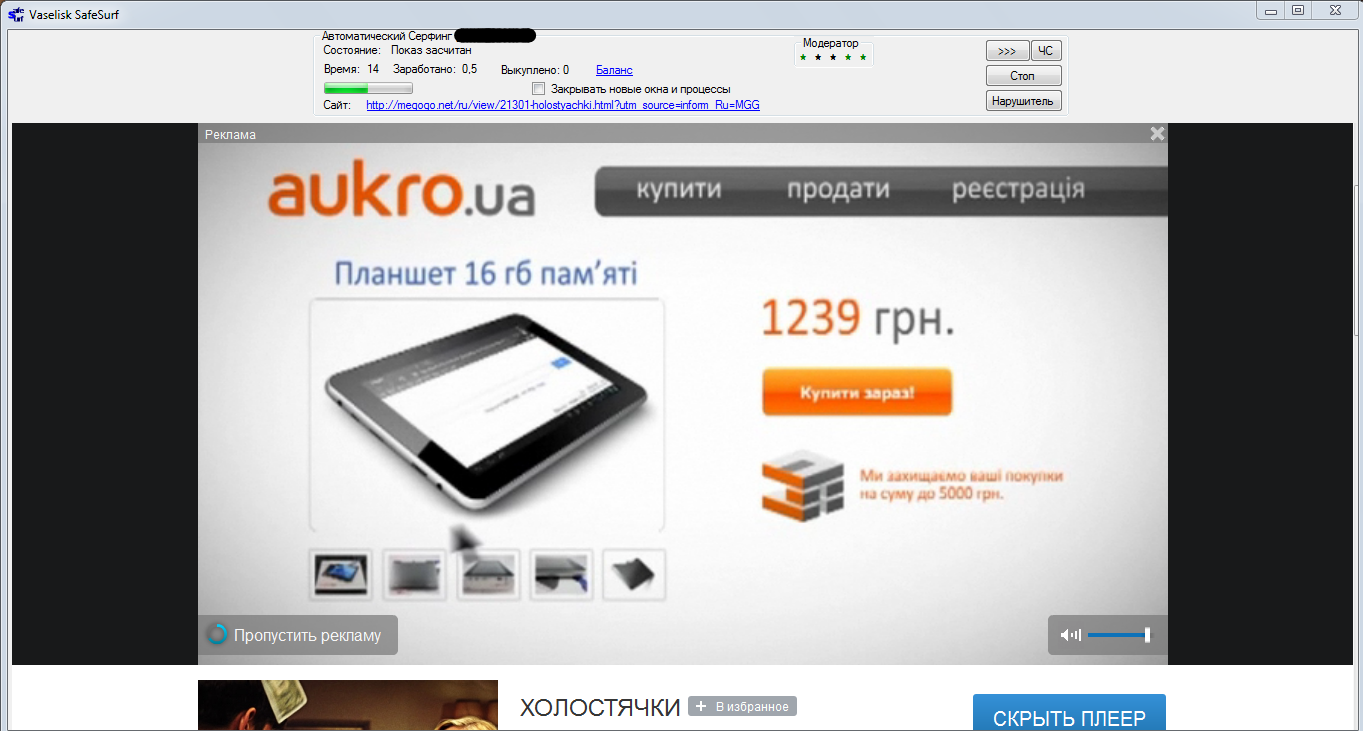 Собственно, о самом факте накруток мы узнали совершенно случайно. Автор решил потестить возможности одной из систем раскрутки сайтов (автосерфинга). Каково же было мое удивление, когда на экране закрутились ролики с Megogo, где активно откручивалась видеореклама aukro.ua.