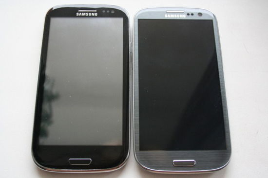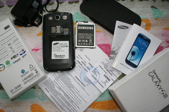 Внешне аппарат и его комплектация воссоздают оригинальный Galaxy S3 просто идеально, сомнений не вызывает буквально ничто. Коробка, краткое руководство, предупреждения, чек, гарантия, «зарядка» — всё на месте, была даже цветастая «сопля» на экран. Тонкий корпус, огромный дисплей, идентичные размеры, одна кнопка на передней панели и фотосенсоры спереди поверху, вспышка, динамик — короче, абсолютно всё в точности такое же. Вот он, рядом с оригиналом, попробуйте отличить (и простите за доморощенные фотки; не муртазин, только учусь).