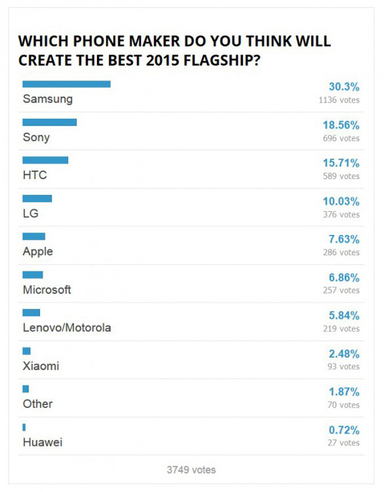 Несмотря на то, что в этом году продажи флагмана компании Samsung были не столь радостными, почти треть опрошенных читателей считают, что корейская компания в 2015 году покажет лучший аппарат на рынке.